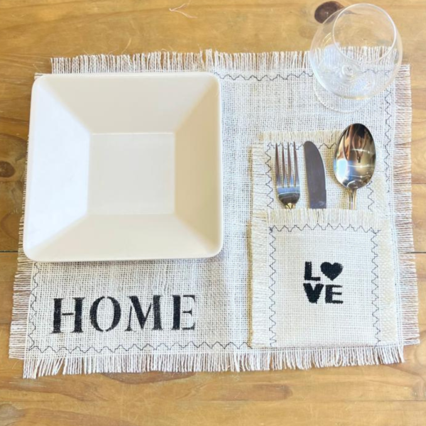 Set x 6 porta cubiertos de arpillera color natural 🤍 Confeccionado a mano, con detalles de costura y estampa en color negro👐🏼
