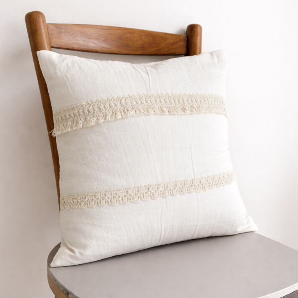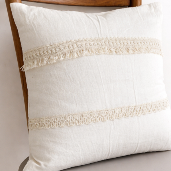 Almohadón con relleno de vellón siliconado 🛋️ Confeccionado en tusor con agregado de puntillas y fleco 🤍